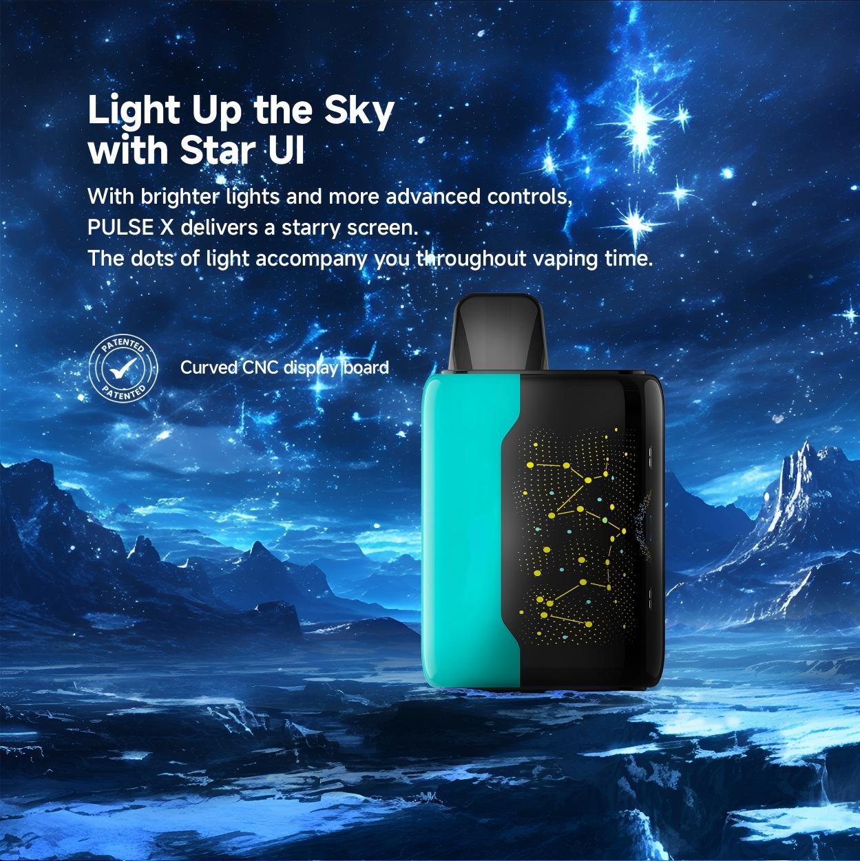 Podsvícený displej a futuristická vesmírná tématika vytváří úchvatný vizuální efekt. Vaping nikdy nevypadal tak stylově!
